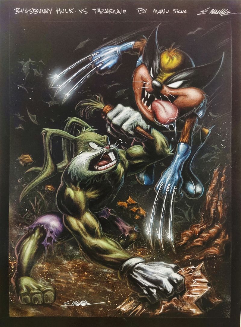 Bugsbunny Hulk vs Tazverine original Art 11x17 Black paper by Manu Silva