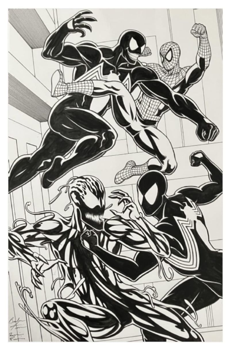 11x17 inch commission of Spider-Man & Black suit Spider-Man vs Venom & Carnage ! Pencils by Brendon Fraim , inks by Brian Fraim !