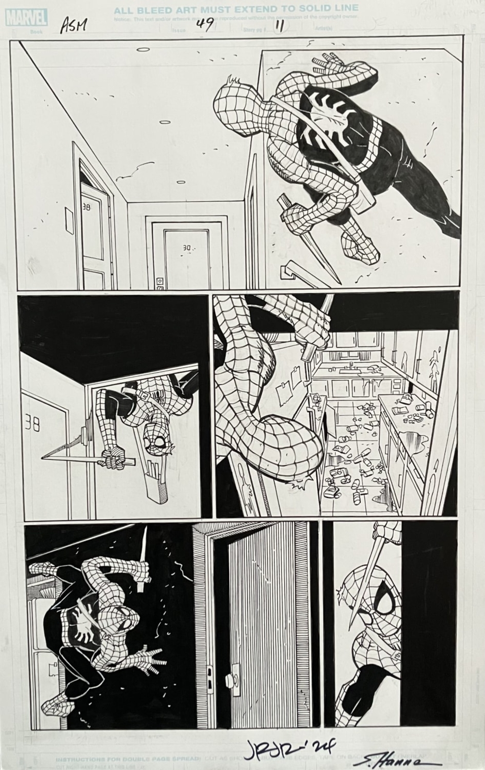 11x17 inch Original Art of Amazing Spider-Man issue 49 page 11 ! Spidey is in every panel ! Pencilled by John Romita Jr.! Inked by Scott Hanna ! Dual-Signed by Romita Jr & Hanna !