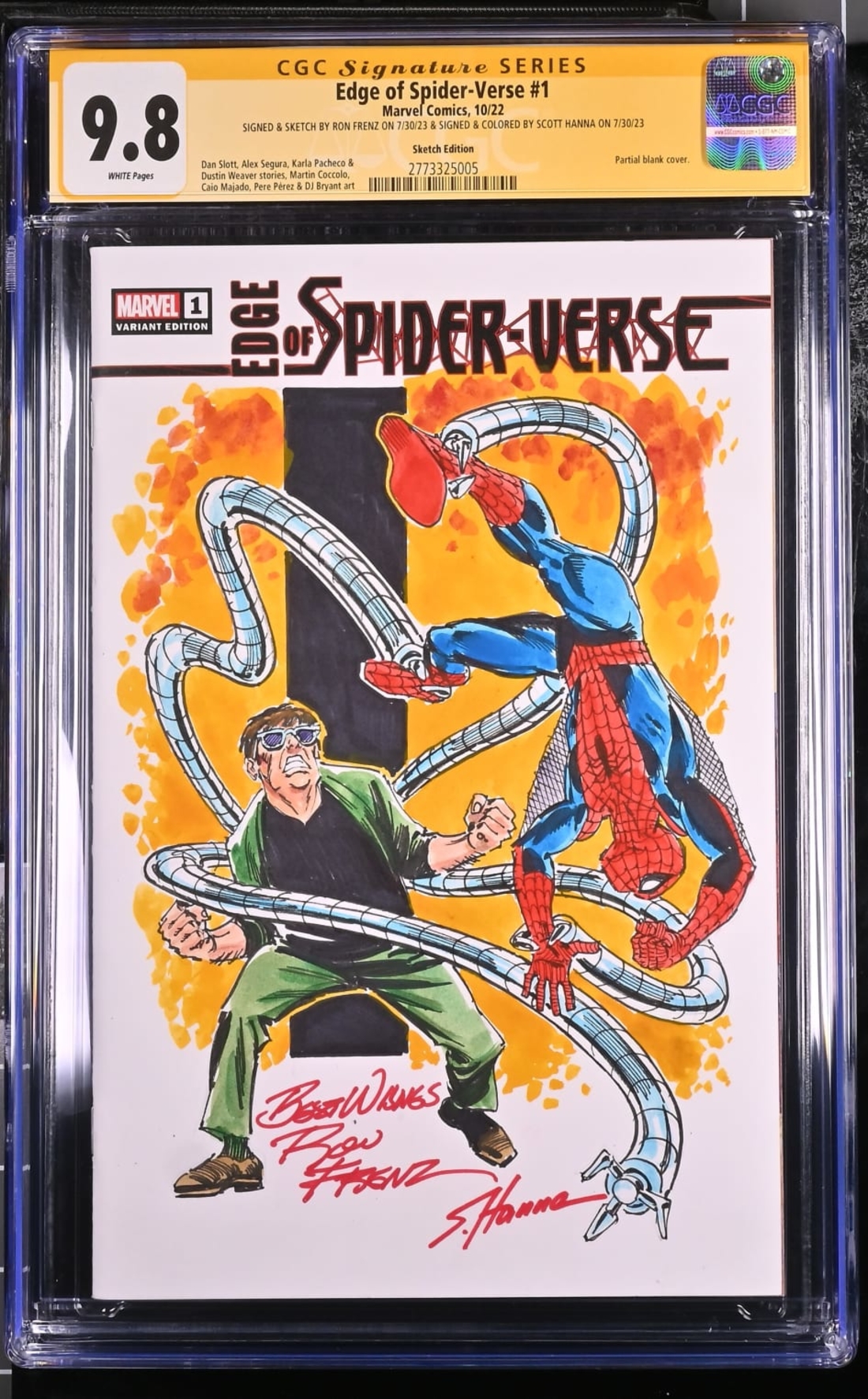 Edge of Spider-Verse #1 | Sketch Edition | CGC 9.8 | Signature SeriesSIGNED & SKETCH BY RON FRENZ ON 7/30/23 & SIGNED & COLORED BY SCOTT HANNA ON 7/30/23Partial blank cover.Dan Slott, Alex Segura, Karla Pacheco &Dustin Weaver stories, Martin Coccolo,Caio Majado, Pere P�rez & DJ Bryant art